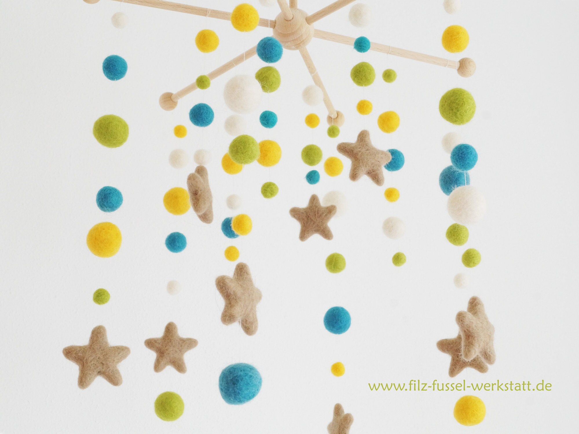 Mit diesen schönen blau, gelb grünen Filzkugeln und Filzsternen kannst Du Dir Dein eigenes Babymobile gestalten.