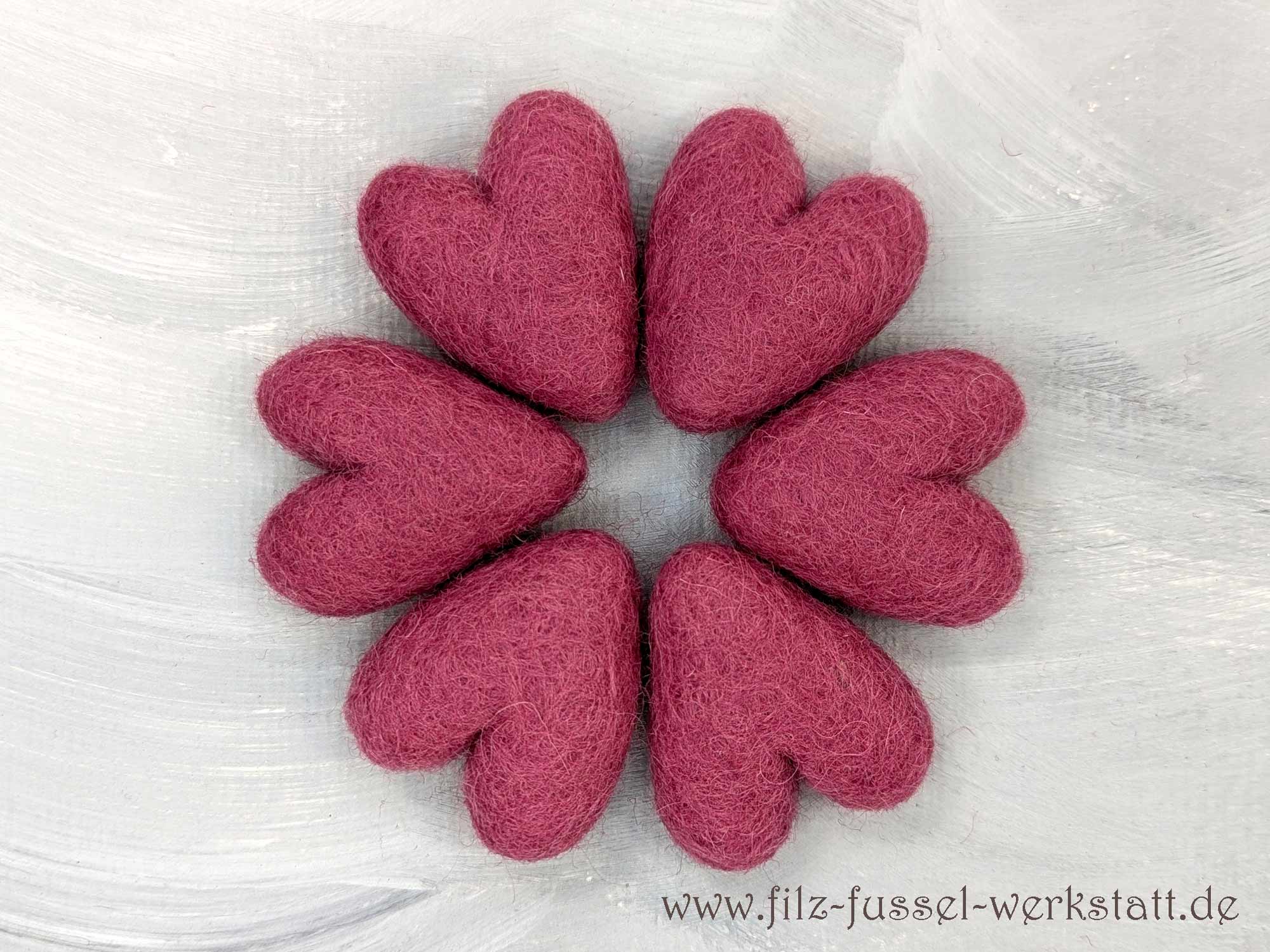 Die himbeerfarbenen Herzen sind aus 100% Wolle (Filzwolle) handgefilzt und eignen sich hervorragend zum Basteln und Dekorieren. Aus den schönen Filzherzen - auch in Kombination mit Filzkugeln - entstehen tolle Girlanden, Mobile, Schlüsselanhänger, Weihnachtsschmuck oder sie zieren einfach als schöne Farbpunkte die Dekoration auf einem Tisch. Auch an einem Mobile machen sich die Filzsterne wunderbar.