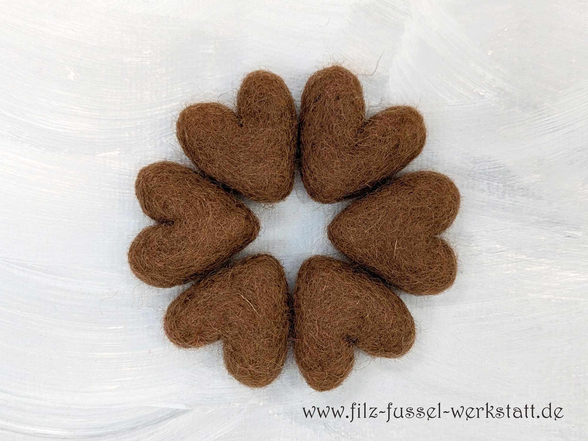 Die kastanienbraunen Herzen sind aus 100% Wolle (Filzwolle) handgefilzt und eignen sich hervorragend zum Basteln und Dekorieren. Aus den schönen Filzherzen - auch in Kombination mit Filzkugeln - entstehen tolle Girlanden, Mobile, Schlüsselanhänger, Weihnachtsschmuck oder sie zieren einfach als schöne Farbpunkte die Dekoration auf einem Tisch. Auch an einem Mobile machen sich die Filzsterne wunderbar.