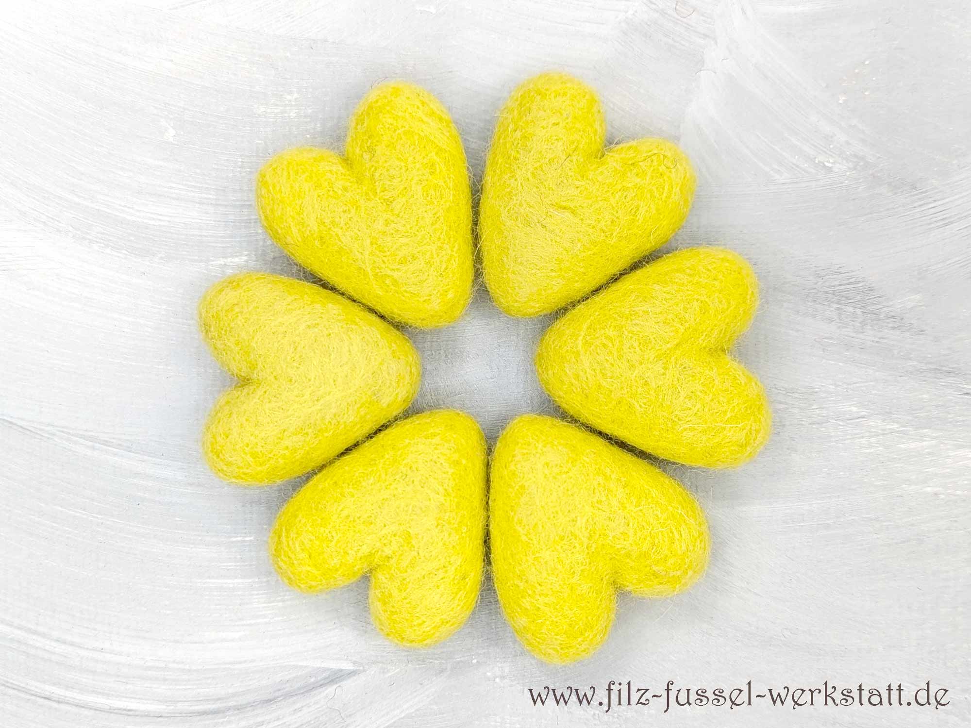 Die zitronengelben Herzen sind aus 100% Wolle (Filzwolle) handgefilzt und eignen sich hervorragend zum Basteln und Dekorieren. Aus den schönen Filzherzen - auch in Kombination mit Filzkugeln - entstehen tolle Girlanden, Mobile, Schlüsselanhänger, Weihnachtsschmuck oder sie zieren einfach als schöne Farbpunkte die Dekoration auf einem Tisch. Auch an einem Mobile machen sich die Filzsterne wunderbar.