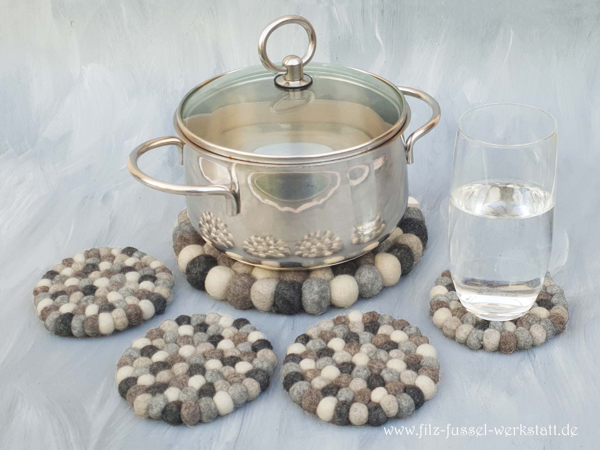 Das Set beinhaltet 1 großen Topfuntersetzer und 4 kleine Glasuntersetzer.