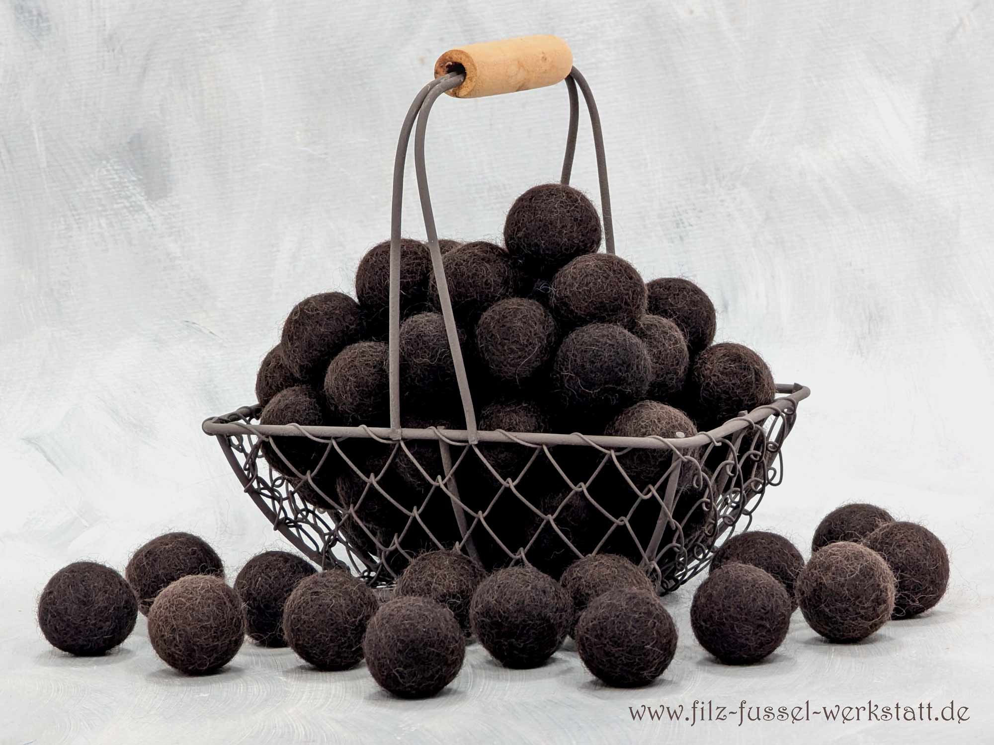 Die dunkelbraunen Filzkugeln / Filzperlen sind aus 100% Wolle (Filzwolle) handgefilzt und eignen sich hervorragend zum Basteln und Dekorieren. Aus den schönen Filzkugeln entstehen Girlanden, Mobile Schlüsselanhänger, Oster- und Weihnachtsschmuck oder sie zieren einfach als schöne Farbpunkte die Dekoration auf einem Tisch. Auch an einem Mobile machen sich die Filzkugeln wunderbar.
