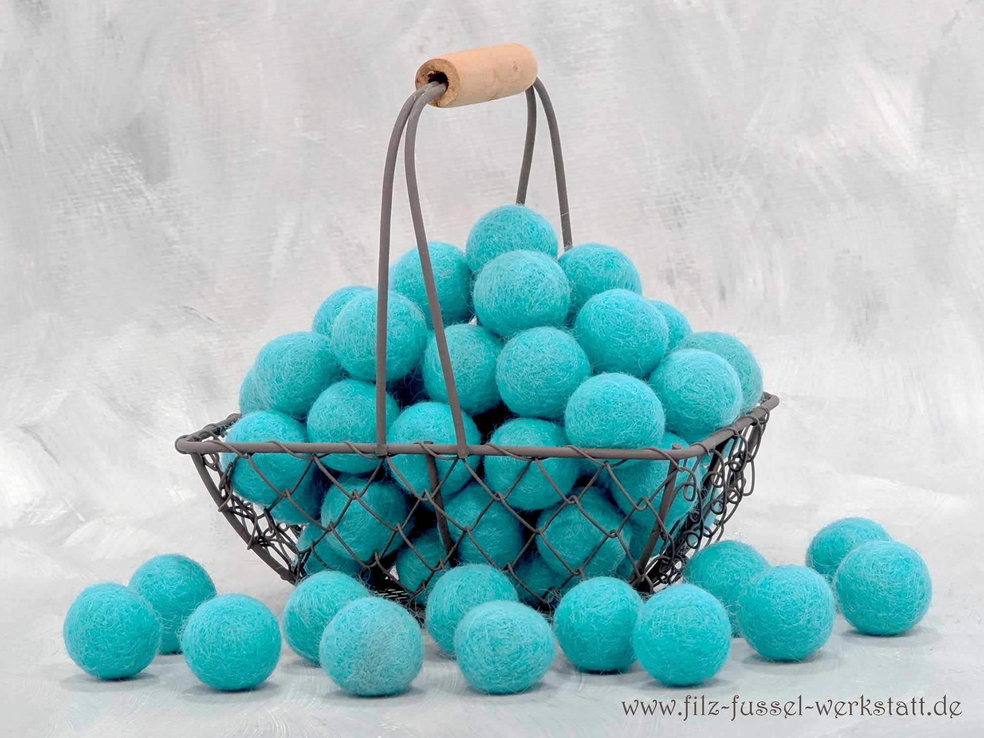 Die lagunblauen Filzkugeln / Filzperlen sind aus 100% Wolle (Filzwolle) handgefilzt und eignen sich hervorragend zum Basteln und Dekorieren. Aus den schönen Filzkugeln entstehen Girlanden, Mobile Schlüsselanhänger, Oster- und Weihnachtsschmuck oder sie zieren einfach als schöne Farbpunkte die Dekoration auf einem Tisch. Auch an einem Mobile machen sich die Filzkugeln wunderbar.