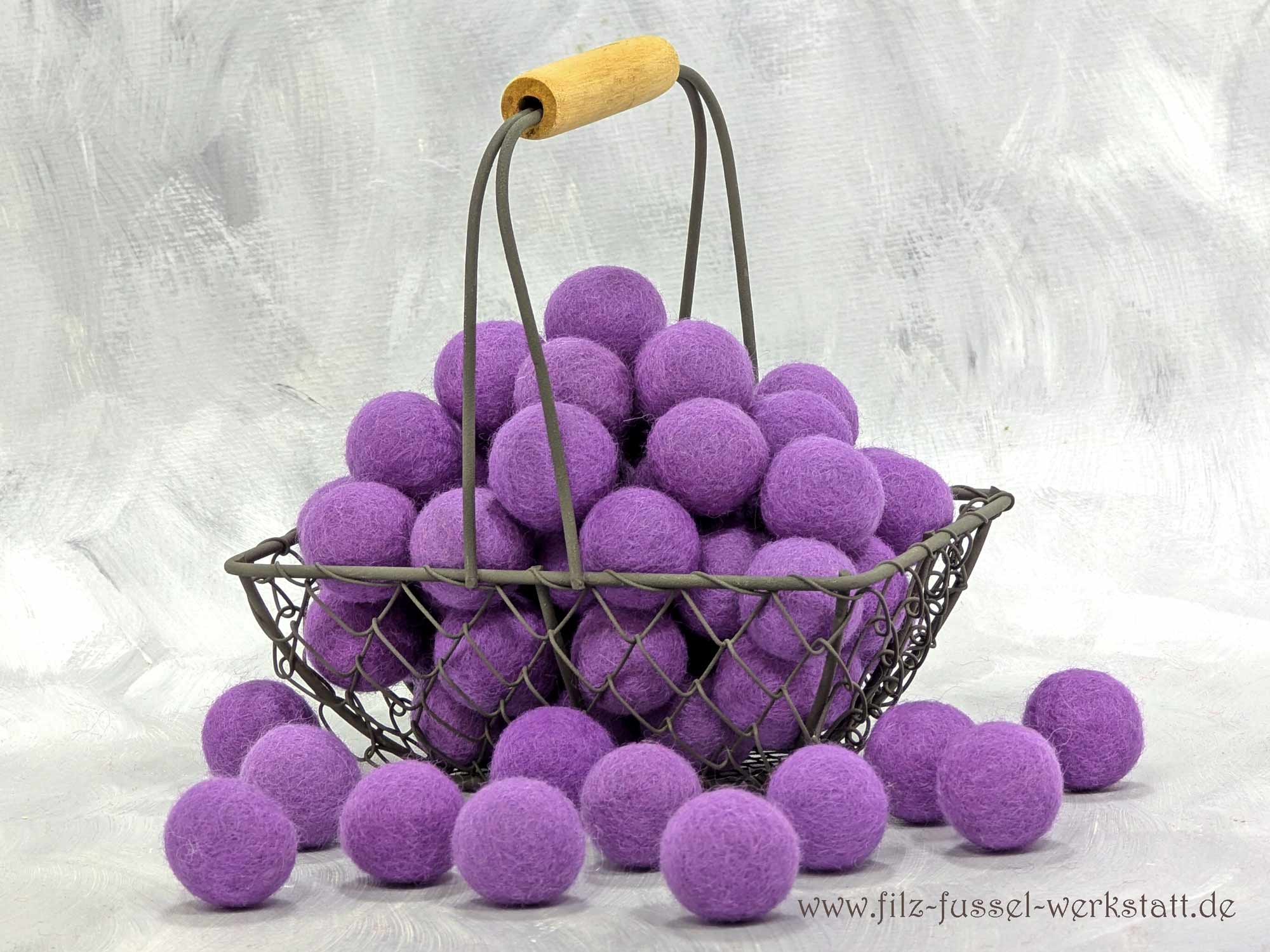 Die lilafarbenen Filzkugeln / Filzperlen sind aus 100% Wolle (Filzwolle) handgefilzt und eignen sich hervorragend zum Basteln und Dekorieren. Aus den schönen Filzkugeln entstehen Girlanden, Mobile Schlüsselanhänger, Oster- und Weihnachtsschmuck oder sie zieren einfach als schöne Farbpunkte die Dekoration auf einem Tisch. Auch an einem Mobile machen sich die Filzkugeln wunderbar.