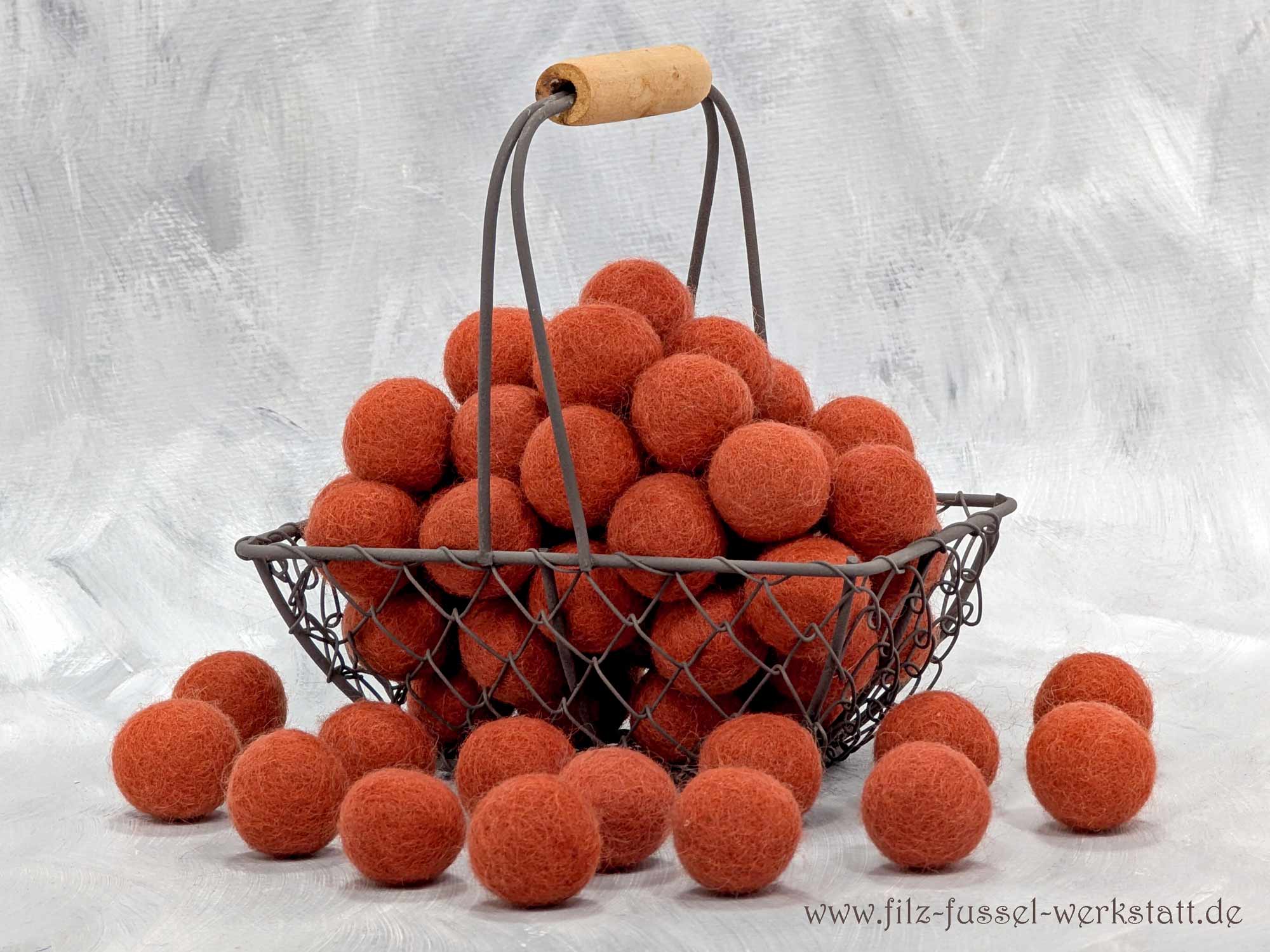 Die rostfarbenen Filzkugeln / Filzperlen sind aus 100% Wolle (Filzwolle) handgefilzt und eignen sich hervorragend zum Basteln und Dekorieren. Aus den schönen Filzkugeln entstehen Girlanden, Mobile Schlüsselanhänger, Oster- und Weihnachtsschmuck oder sie zieren einfach als schöne Farbpunkte die Dekoration auf einem Tisch. Auch an einem Mobile machen sich die Filzkugeln wunderbar.