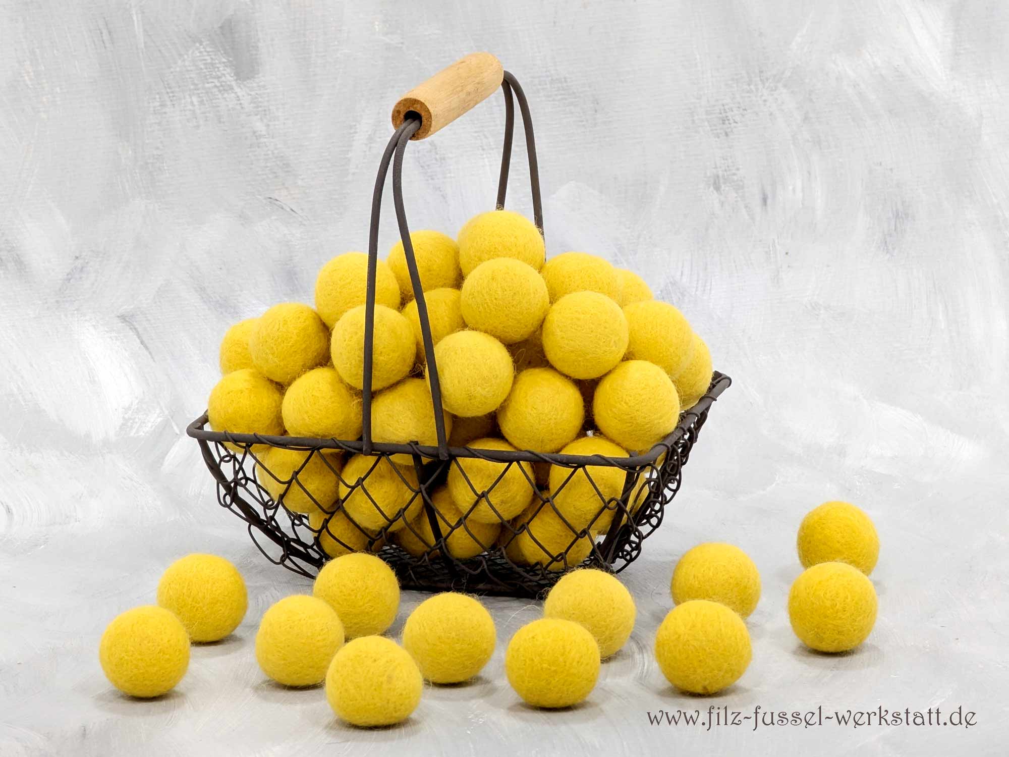 Die sonnengelben Filzkugeln / Filzperlen sind aus 100% Wolle (Filzwolle) handgefilzt und eignen sich hervorragend zum Basteln und Dekorieren. Aus den schönen Filzkugeln entstehen Girlanden, Mobile Schlüsselanhänger, Oster- und Weihnachtsschmuck oder sie zieren einfach als schöne Farbpunkte die Dekoration auf einem Tisch. Auch an einem Mobile machen sich die Filzkugeln wunderbar.