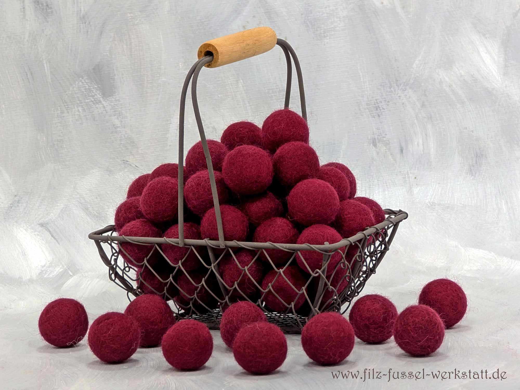 Die weinroten Filzkugeln / Filzperlen sind aus 100% Wolle (Filzwolle) handgefilzt und eignen sich hervorragend zum Basteln und Dekorieren. Aus den schönen Filzkugeln entstehen Girlanden, Mobile Schlüsselanhänger, Oster- und Weihnachtsschmuck oder sie zieren einfach als schöne Farbpunkte die Dekoration auf einem Tisch. Auch an einem Mobile machen sich die Filzkugeln wunderbar.