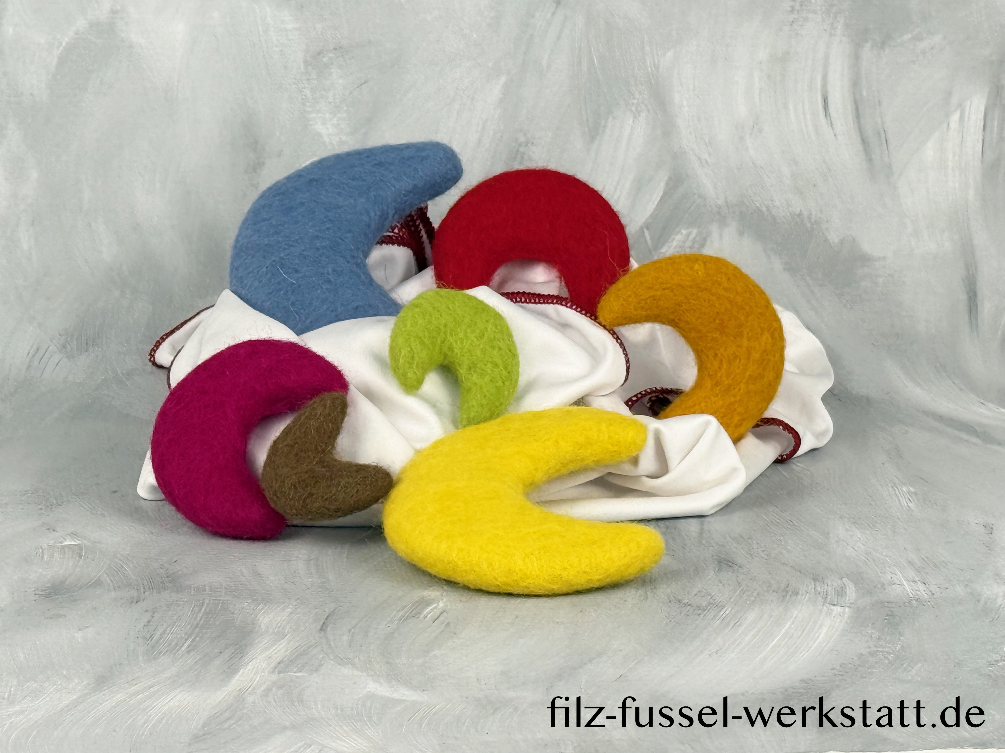 Die farbenfrohen Monde sind aus 100% Wolle (Filzwolle) handgefilzt und eignen sich hervorragend zum Basteln und Dekorieren. Mit einem schönen Mond - auch in Kombination mit Filzwolken, Filzsternen, Filzkugeln und Filzherzen - entstehen tolle Mobile oder sie zieren einfach als schöne Farbpunkte die Dekoration auf einem Tisch