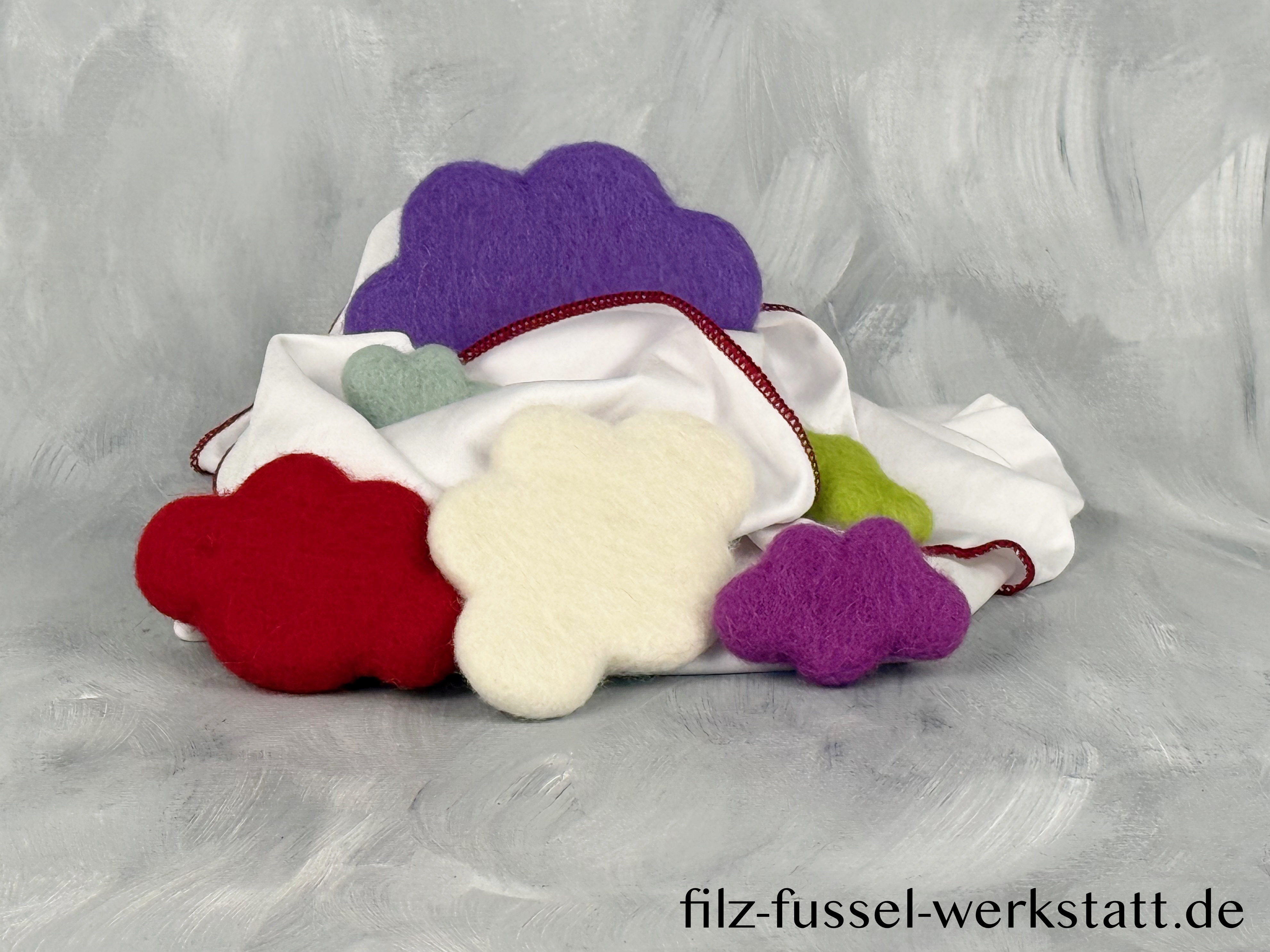 Die farbenfrohen Wolken sind aus 100% Wolle (Filzwolle) handgefilzt und eignen sich hervorragend zum Basteln und Dekorieren. Aus den schönen Wolken - auch in Kombination mit Filzsternen, Filzmond, Filzkugeln und Filzherzen - entstehen tolle Mobile oder sie zieren einfach als schöne Farbpunkte die Dekoration auf einem Tisch