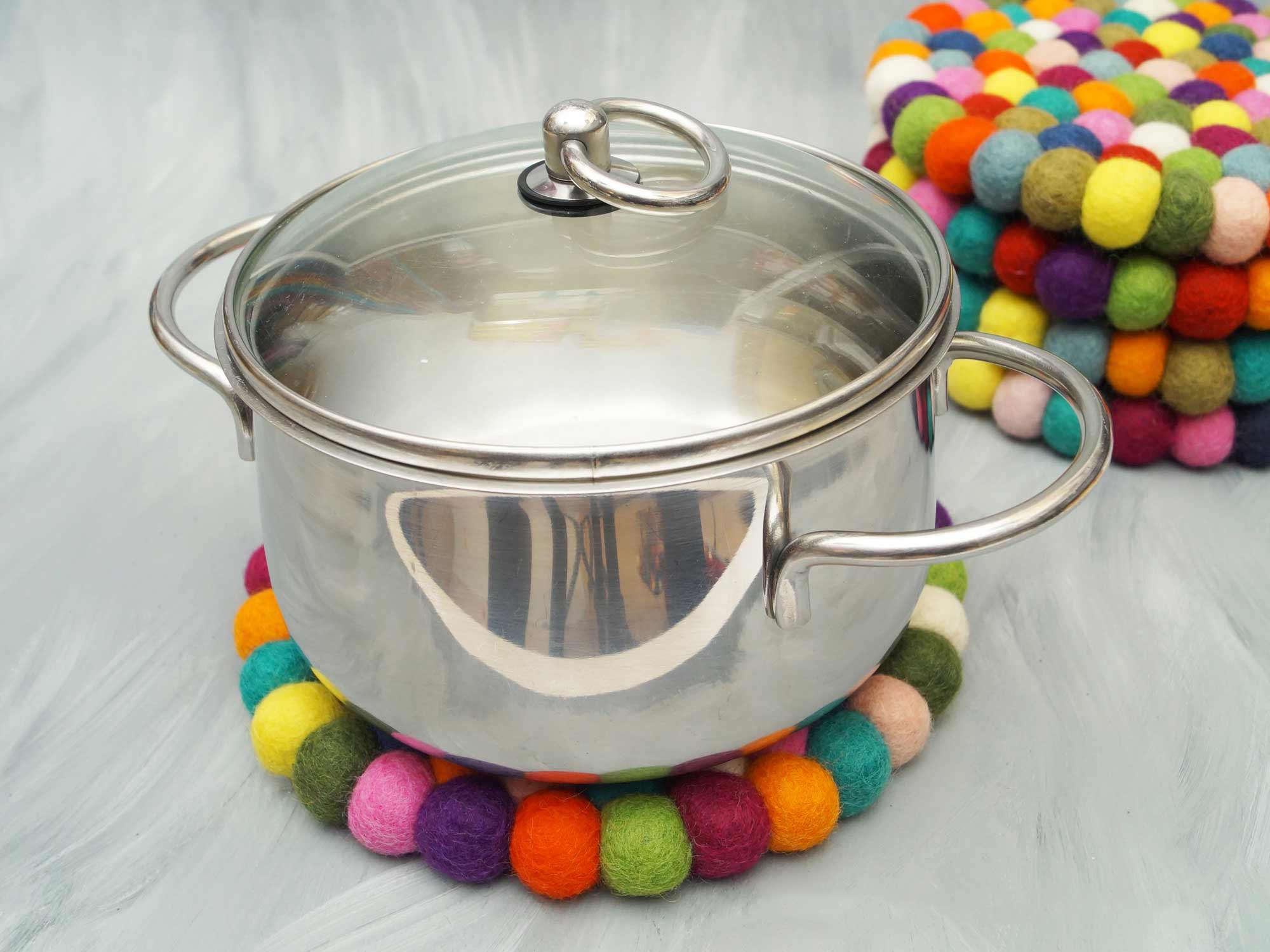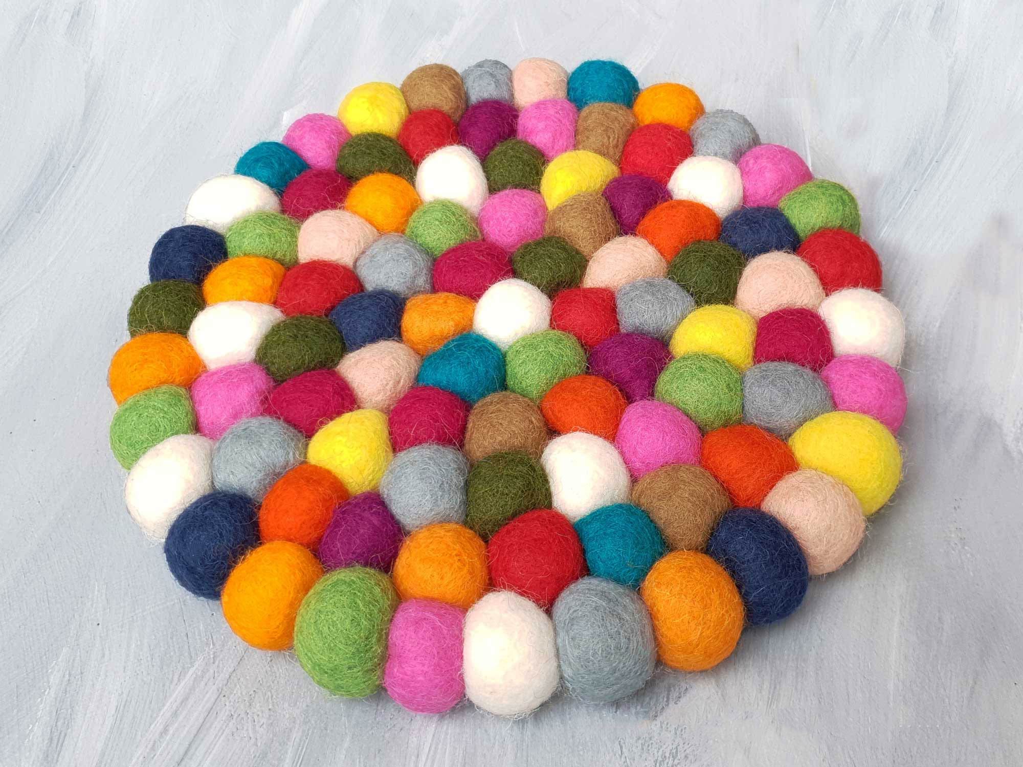 Dieser bunte und farbenfrohe Topfuntersetzer - bestehend aus vielen handgefilzten festen Filzkugeln - verziert jeden Esstisch,egal ob zu Weihnachten, Geburtstagen, Taufen oder zu vielen anderen Anlässen...