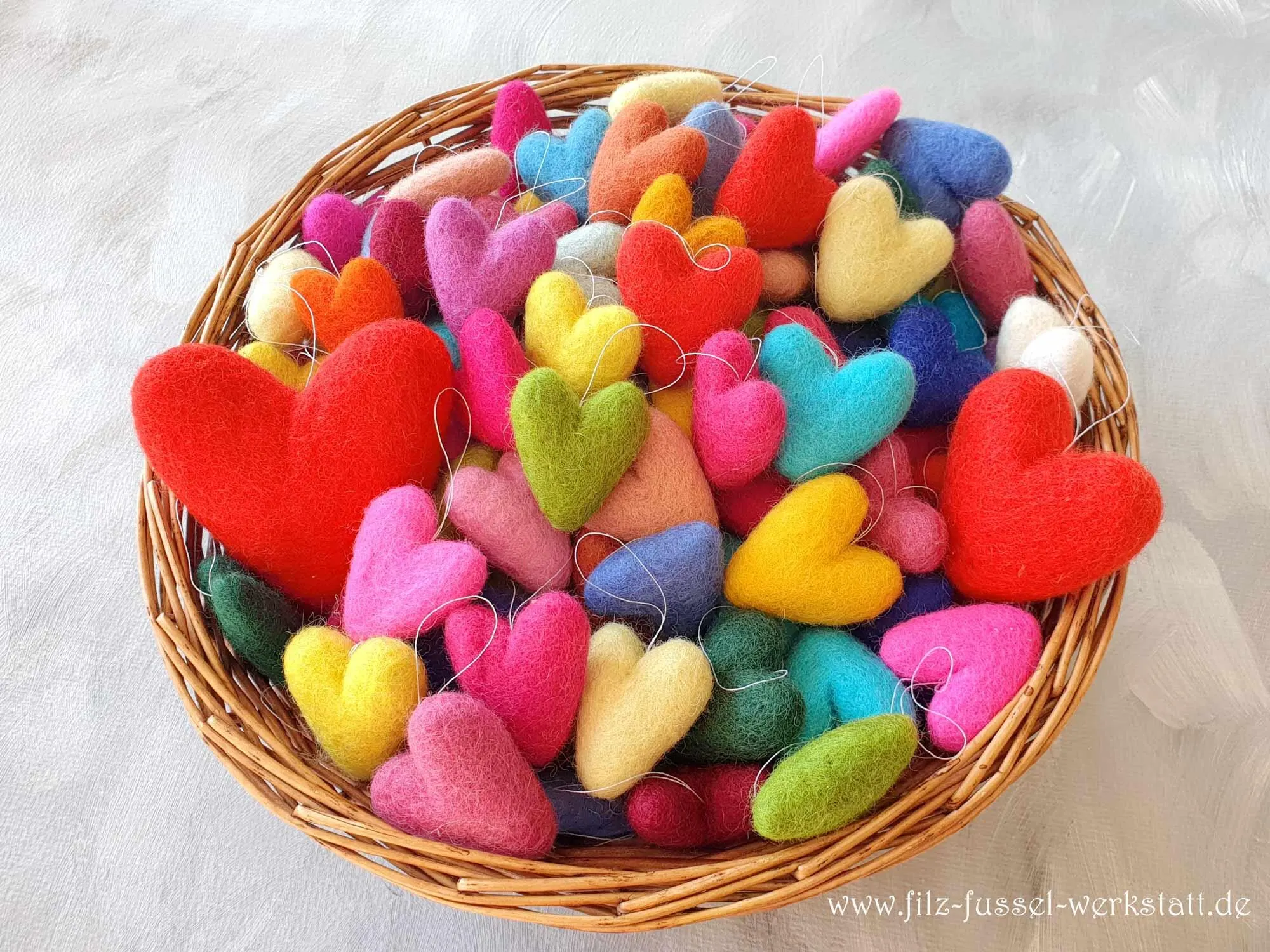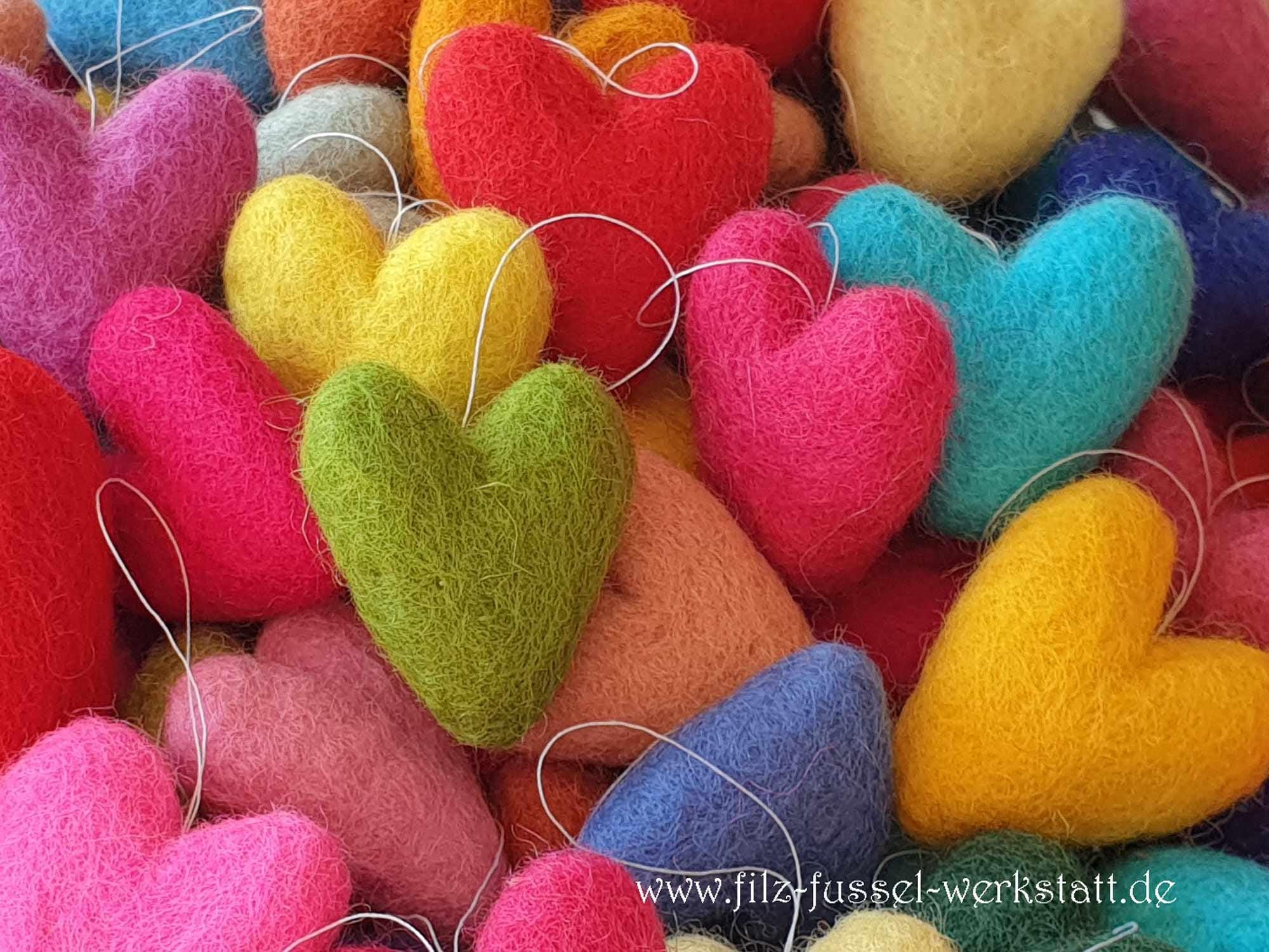 Die farbenfrohen Herzen sind aus 100% Wolle (Filzwolle) handgefilzt und eignen sich hervorragend zum Basteln und Dekorieren. Aus den schönen Filzherzen - auch in Kombination mit Filzkugeln - entstehen tolle Girlanden, Mobile, Schlüsselanhänger, Oster- oder Weihnachtsschmuck oder sie zieren einfach als schöne Farbpunkte die Dekoration auf einem Tisch. Auch an einem Mobile machen sich die Filzherzen wunderbar.